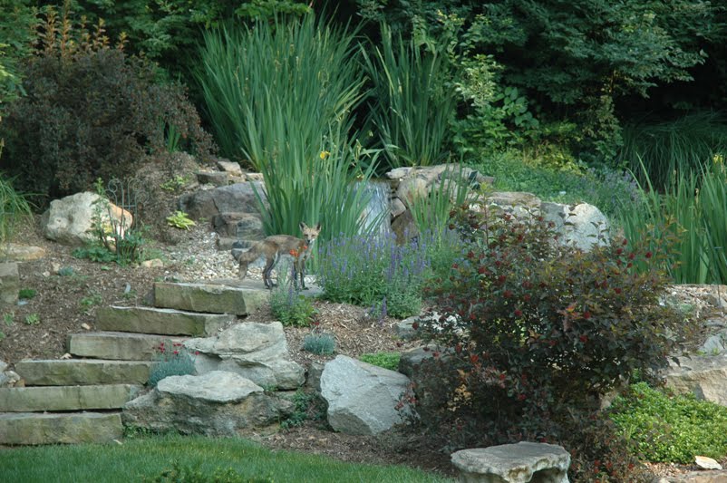 Our cat Smeagol was chattering at the door peering out of the window so I looked out. There was a fox. He walked around the upper pond and I thought he was trying to find a place to get a drink. He stared right at me, just like the deer, while I held up the camera to take a picture. Then he got pretty close and before I could catch a better shot of him, he leaped across the water to the little island. I saw that he had something in his mouth as he leaped back across and ran into the woods. All in about three seconds. It dawned on me that the mallard ducks had their eggs on that island and that’s what the fox was hoping to—and did—get. I felt bad that I didn’t stop the fox, but I had no idea that’s what he was getting ready to do. A little bit later, I heard Smeagol again and I looked. There’s Mr. Fox prowling around the pond. I tapped on the window and he darted off. When Norm got home I took him outside to show him the eggs and I rattled on about the fox. But no eggs in sight. That sly fox did what he knows best. Survival of the fittest in nature.